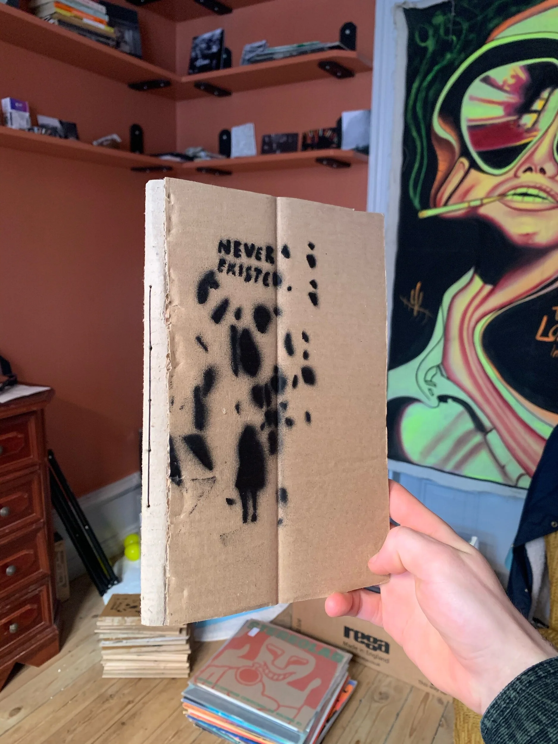 “never existed” zine, covers made from recycled cardboard, stenciled artwork, street photography in Stockholm, only 15 copies made. self published